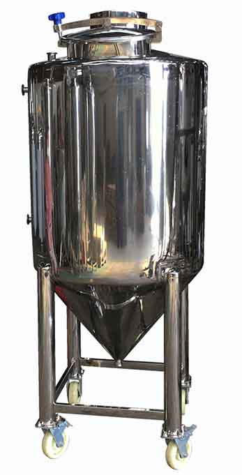 啤酒发酵罐罐体为圆柱形,顶盖为碟形,底盖为采用60°~90°倾斜度的锥形有利于罐中酒液对流强烈,发酵速度快,而且利于排放酵母和发酵罐中杂质;在酒精发酵过程中,为了回收CO2气体及其所带出的部分酒精,发酵罐宜采用密闭式。罐底部有手孔、与罐顶连接的CO2、空气、CIP等的进出管、内容物容积测量装置、空罐探头及保压装置等。