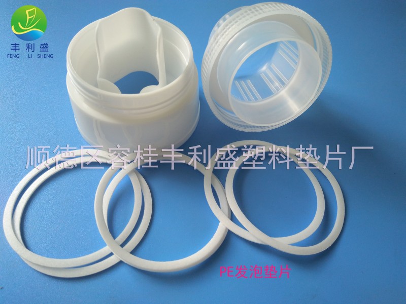 PE垫片:冲压成 PE发泡垫片主要用于酒类、化妆品、医药品瓶盖用高级PE衬垫。片材由PE材料构成,成品为雪白色,可以进行双面覆膜.